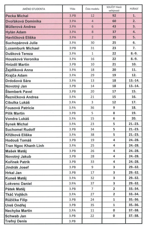 Pro modely mohli v soutěži hlasovat všichni studenti a zaměstnanci školy, včetně široké veřejnosti. Ti rozhodli o pěti nejlepších modelech v následujícím pořadí (5. místo Eliška Havlíčková, 4. místo Adam Hylán, 3. místo Andrea Müllerová, 2. místo Dominika Dvořáková a 1. místo Michal Pecka), jejich pečlivost a usilovná práce jim vynesla i nemalé finanční ohodnocení.