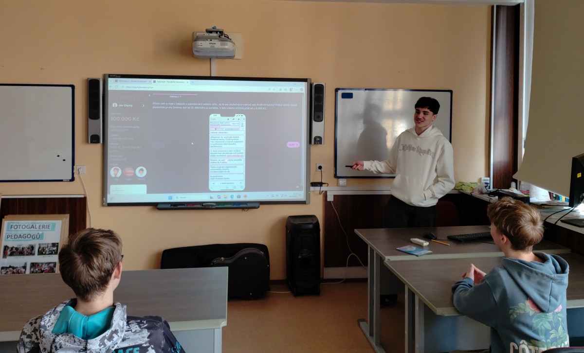 Žáci hovořili především o aktuálních podvodných technikách, pomocí nichž kyberpodvodníci připravují své oběti především o peníze, například prostřednictvím podvodných e-mailů, SMS zpráv nebo telefonních hovorů. Nakonec přednášející provedli žáky vzdělávací aplikací KYBERTEST.CZ (https://www.kybertest.cz/), která slouží k šíření povědomí o aktuálních podvodech spadajících do oblasti kyberkriminality.